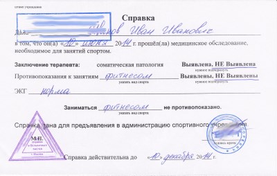 Итогом прохождения осмотра станет медсправка для спортзала, в которой указаны такие данные: